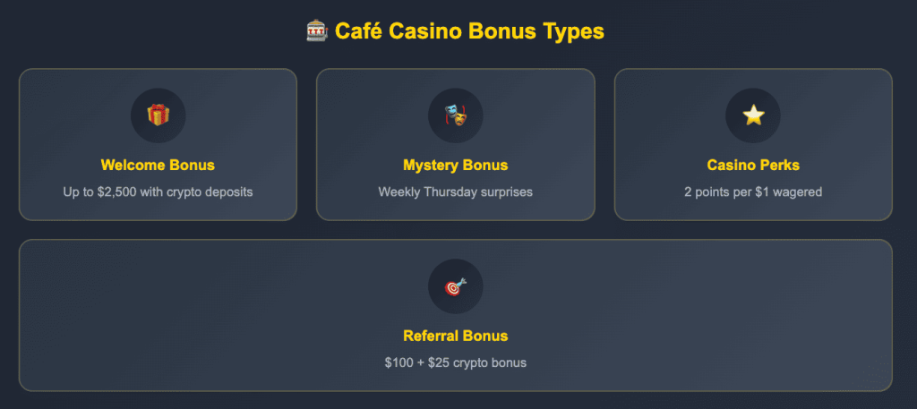 | Referral Bonus | When you hear Café Casino $100 no deposit bonus, know that they are talking about the referral promo. Every time a new player registers on the platform using your referral link, you will be awarded $100. If the new player makes their first top up using cryptocurrency, you will get another $25 crypto bonus. You can earn up to $125 for every player you refer to the platform. |