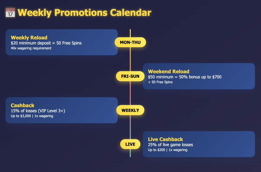 | Weekend Reload Bonus | This promo offer is available every week from Friday to Sunday. Every time you make a minimum deposit of $50 within the promo period, you will get 50% of your top-up as a reward, up to $700. In addition to that, you will get 50 Free Spins. |
