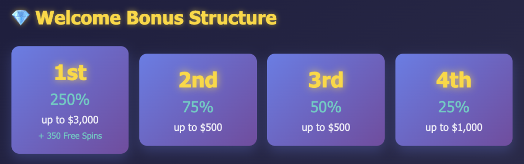 Crownplay welcome bonus gives players 250% of their first deposit, up to $3,000. In addition to that, you will also get 350 free spins and 1 bonus crab. The prize funds must be wagered 35x before they will be available for withdrawal, while winnings from free spins must be wagered 40x. It is also important to mention that you will have 10 days to meet the wagering requirements for every promotion, or they will become invalid. Crownplay welcome bonus extends to the fourth deposit.