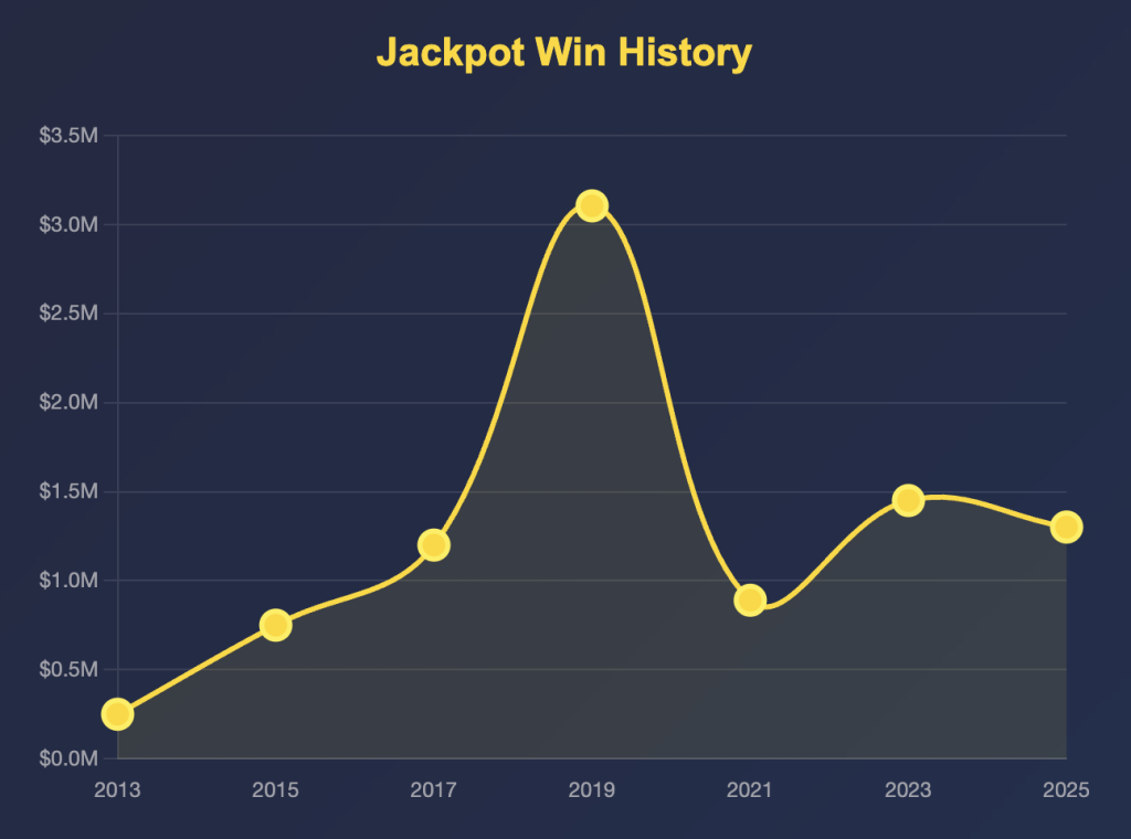 With a starting seed of $50,000, the biggest win recorded in this game is $3,104,615, while the smallest win was $147,359. However, during its active days, the jackpot frequently goes over $1 million. The last time a player hit a jackpot on the machine was nearly two years ago.
