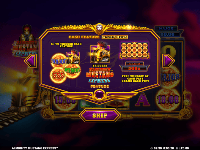 The CashLock feature represents the primary bonus mechanic in Almighty Mustang Express. Special CashLock symbols appear during gameplay, locking in cash prize values when they land. These locked symbols remain in position while the feature plays out, accumulating potential wins. The Grand Cash Pot delivers a massive 500x multiplier as the top prize within the CashLock system. This feature operates during both the Almighty Mustang Express Feature and potentially within free spins rounds.