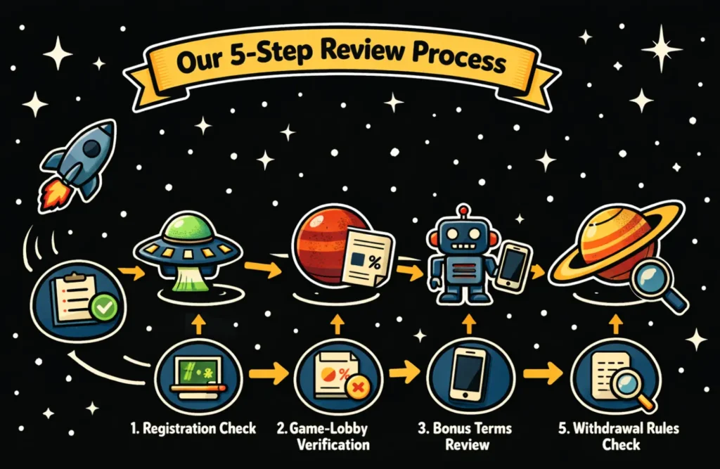 How we test: we review the sign-up flow, search the casino lobby for live Endorphina titles, inspect bonus terms before deposit, test mobile browsing, and verify that withdrawal rules are visible before registration. If a casino hides critical terms or makes it difficult to confirm software availability, it should not be treated as a top recommendation.