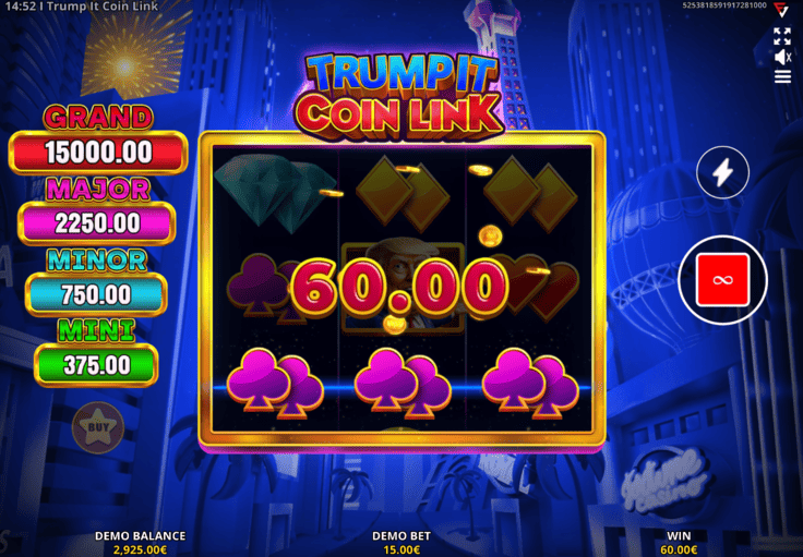 As we expected, it has free spins, the wilds (ability to substitute all other symbols on the reels which helps to create winning combinations with regular symbols), and scatter symbols. The RTP of Trump It Coin Link slot is 96.5%, which is quite high and we have nothing to complain of. The house edge is thus 3.5%. This gives us a house return that is somewhat higher than the industry average, but not really enough to make a big difference.