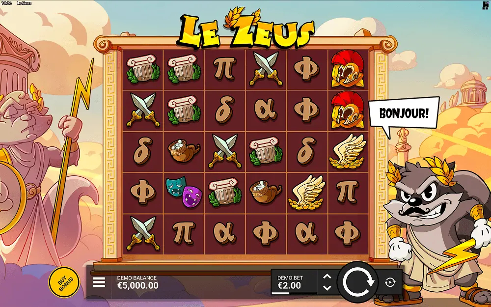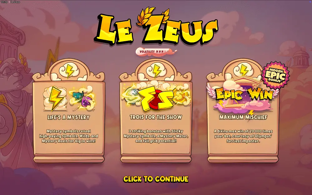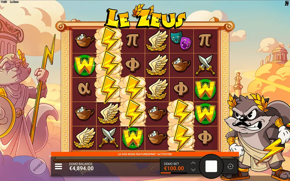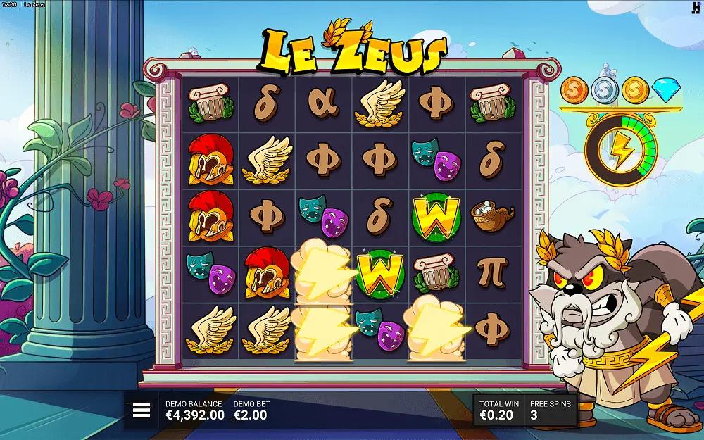 Le Zeus includes three bonus modes: Bolt & Run, Myth-Taken Identity (with a Mystery Meter), and Gods Just Wanna Have Fun (a high-intensity setup filled with Mystery symbols).
