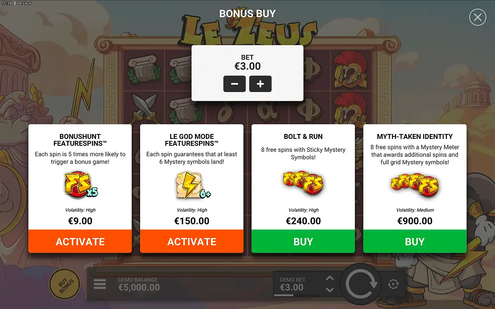 Four feature buys drop accelerated access to bonus content, enhancing strategic flexibility for experienced players exploring how to play Le Zeus optimally.