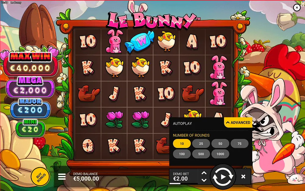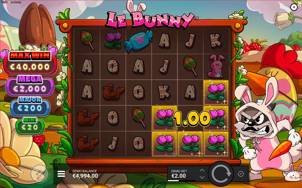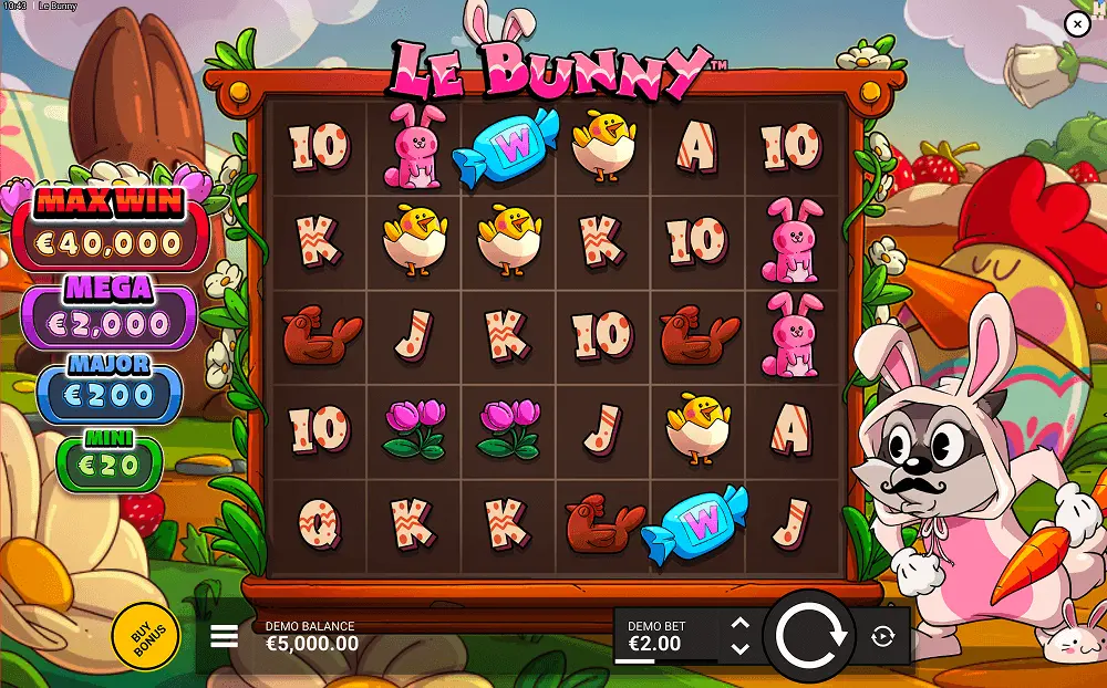 Smokey the raccoon returns dressed in bunny attire for this Easter-themed slot, blending whimsical character design with springtime celebration motifs. Hacksaw Gaming built the “Le” series around this mischievous raccoon protagonist, giving each installment a distinct setting while preserving the character’s recognizable personality. In the Le Bunny online game, Smokey trades frontier gear or fishing tackle for pastel bunny ears and seasonal props, creating a lighthearted atmosphere that contrasts with more serious or dark-themed slots in the market.