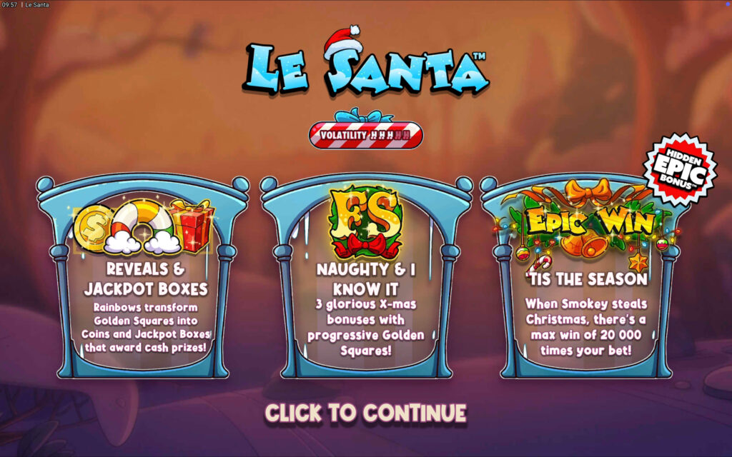 | Le Santa Free Spins | 3+ Scatter Symbols | 10-15 Spins + Retriggers |