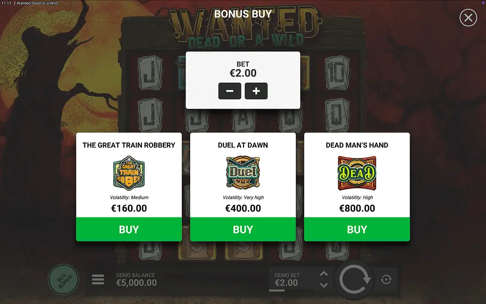 Yes. Bonus Buy lets you purchase feature access at set costs: The Great Train Robbery (80×), Duel at Dawn (200×), and Dead Man’s Hand (400×) of your stake.
