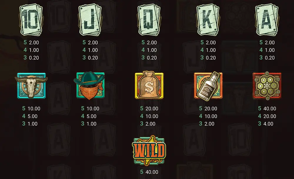 The first ones include the standard playing cards like 10, A, J, Q, and K. When it comes to the symbols that bring higher payouts, these include themed icons like outlanders (outlaw hats or bandit masks), skulls, Whiskey bottles, gun chambers, and money bags.