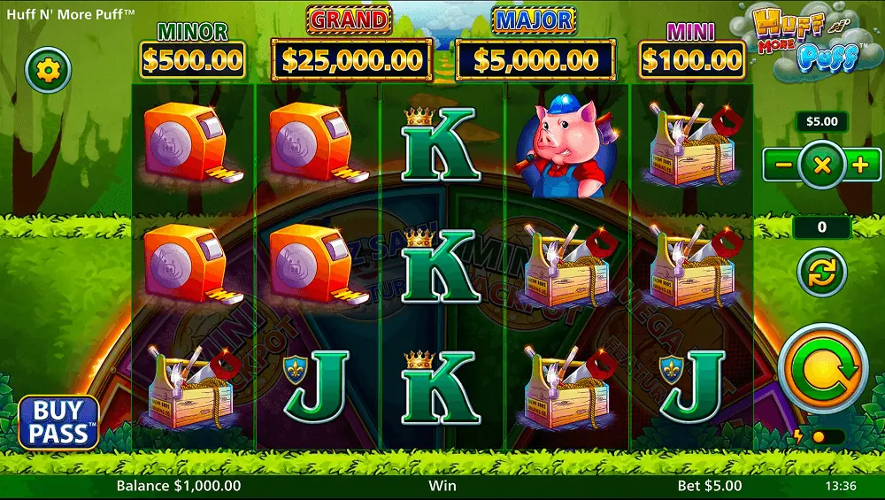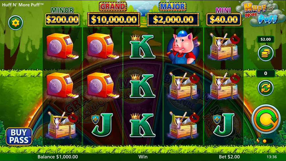 Every Hard Hat symbol then converts frames from straw to sticks, and finally to brick. Multipliers and jackpots are revealed after the wolf blows the houses away. 3+ Buzz Saw symbols will trigger the bonus wheel, where Mini, Minor, Major, and Grand jackpots can be won.