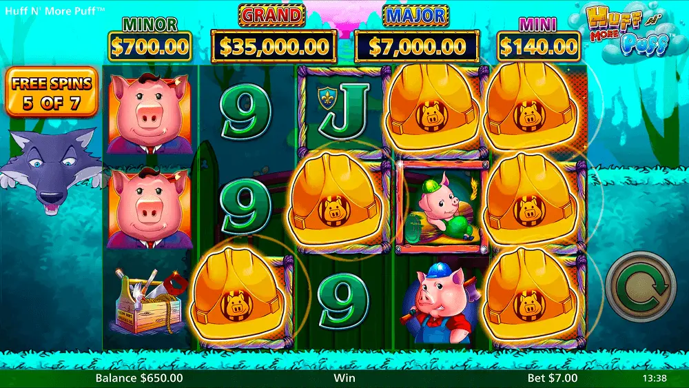 Now that you understand the Huff N’ More Puff theme, we can discuss the core features of the slot. Framing, free spins, and jackpots help the game to stand out. 6+ Hard Hat symbols landing anywhere on the reels will trigger free spins.