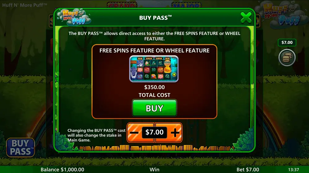 Huff N’ More Puff offers a bonus buy option. The cost of this feature is determined by your stake. A $5.00 stake means that the feature will cost $237.50. This is compared to $9.50 for a $0.20 stake. Either the free spins or the wheel feature can be chosen. Note that editing the “BUY PASS” amount will change your base game stake.