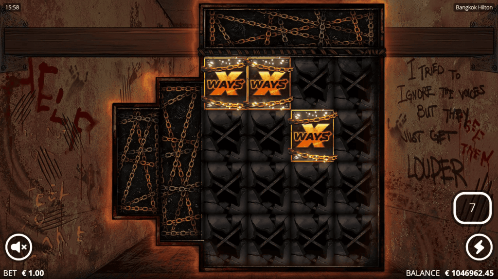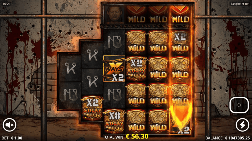 The Bangkok Hilton slot features uncensored, gritty graphics that paint a vivid picture of the low-life environment that the prisoners locked up in these cells live in and how their cries are stifled by the cracked walls. It is a place where guards lock the bars and lose the keys. In addition to the images of prisoners, lower-paying symbols (letters and numbers) forged with steel also appear on the reels. The graphic masterpiece extends beyond the reels. The reel sits in an isolated walkway that has its walls riddled with bullets and painted with blood splatters like a scene from a prison escape gone wrong.