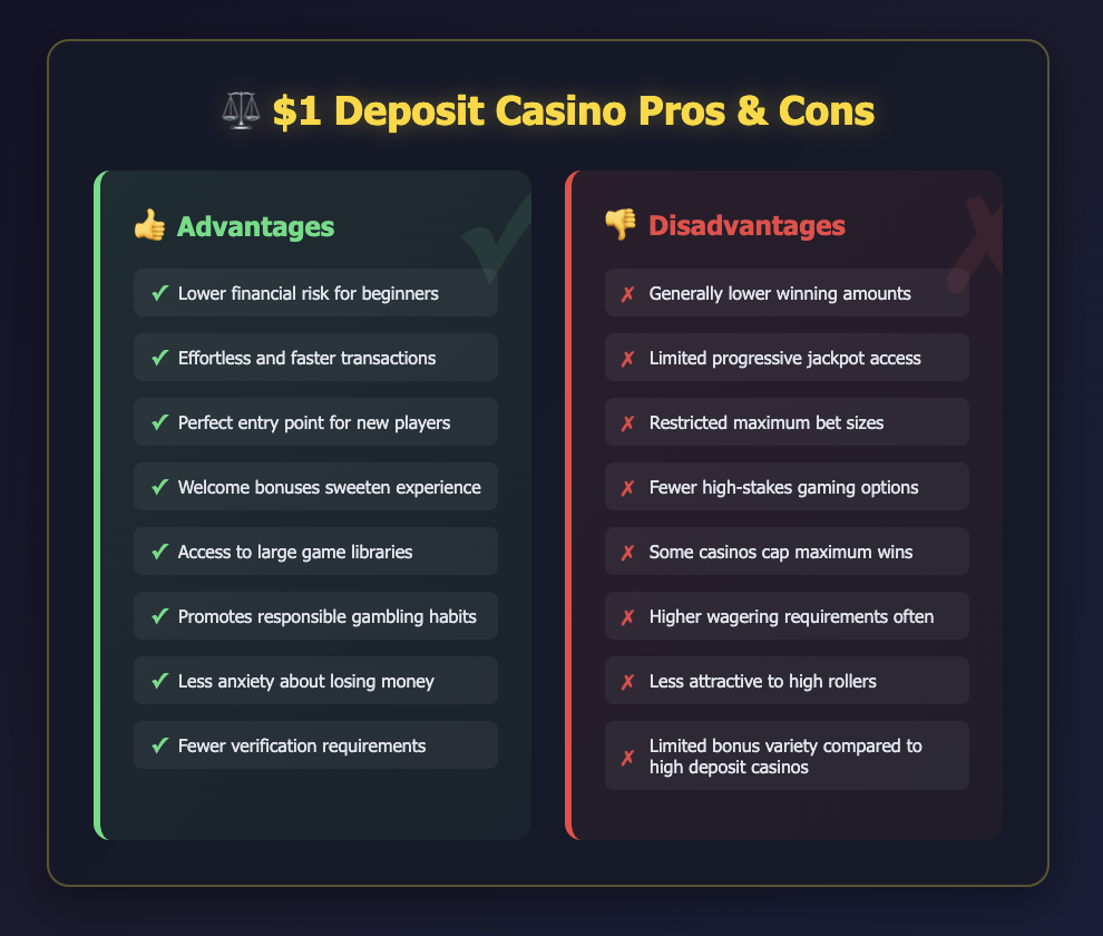 A one dollar deposit casino may not catch the eyes of high rollers, but they are always a treasure for recreational players. This category of punters wants to have maximum fun with the least possible investment. If you are one of those searching for minimum deposit online casinos, pause and think about their pros and cons. This will help you to come up with a strategy for the best possible experience.