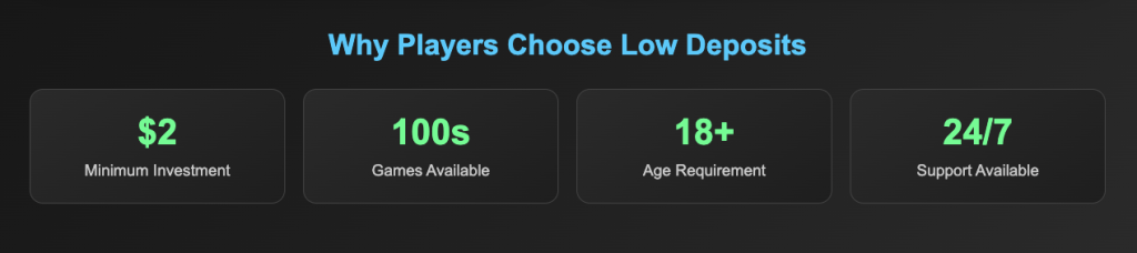 A 2 dollar deposit casino refers to an online website where the punters can make bets starting from $2 or £2 only. Such online destinations are low risk and have lower entry requirements. This makes it easier for players who are averse to the high risk of high-stakes sites to board them. Other pros of a minimum deposit online casino are: