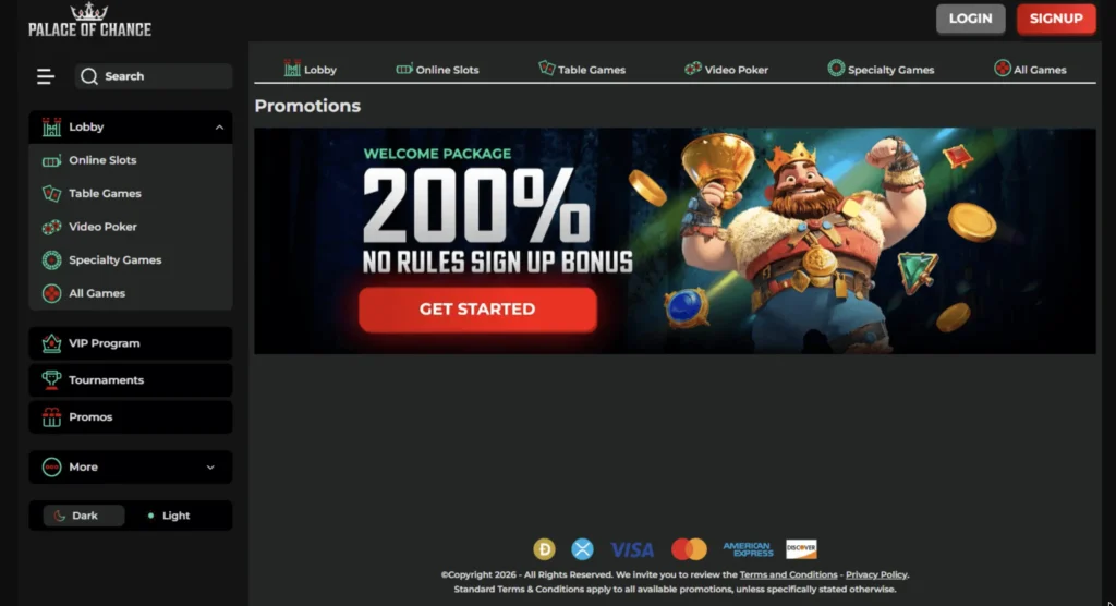 After completing registration and the Palace Of Chance Casino Login, navigate to the cashier section. Select your preferred deposit method, enter the amount meeting the minimum threshold ($30 for cards, $10 for Litecoin), and locate the coupon code field. Enter the applicable promotional code before confirming the transaction. The promotional credit is applied automatically once the deposit is confirmed. Ensure you read the game restrictions before playing, as the 10x requirement applies exclusively to reel games and keno, meaning table game play may void the promotion entirely.