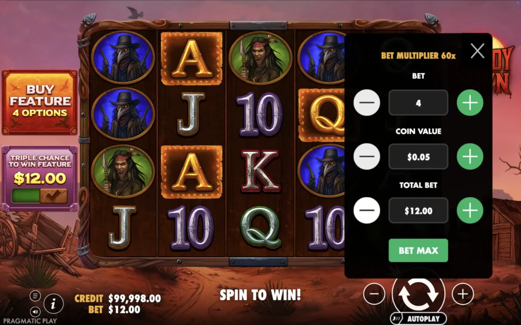 Bloody Dawn arrives from Pragmatic Play as a darkly atmospheric slot machine that blends Western frontier imagery with vampiric horror. The game operates on a 5-reel, 4-row grid offering 1,024 ways to win, and delivers high-volatility gameplay designed for players who chase substantial payouts rather than frequent small wins. With a maximum return-to-player rate of 96.5 percent and a win ceiling of 5,000 times the total stake, this online game positions itself firmly in the high-risk, high-reward category of modern video slots. The betting range spans from $0.20 minimum up to $240 maximum per standard spin, though certain casino implementations allow stakes reaching $720. An optional ante bet feature triples both the total stake and the probability of triggering the free spins round, while a direct feature-buy option lets players purchase entry to the bonus game for 100 times their bet. Cascading tumble mechanics combine with an escalating win multiplier and a unique Gold symbol transformation system to create layered gameplay that rewards consecutive winning combinations.