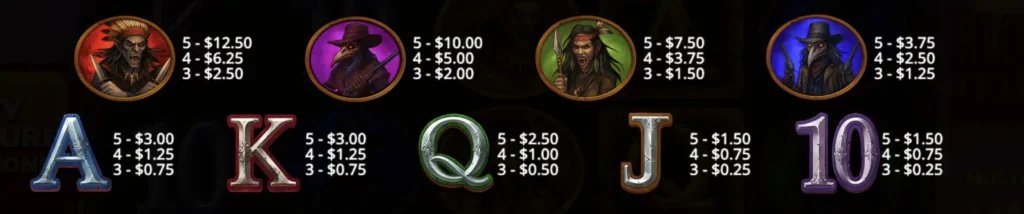 The symbol hierarchy in Bloody Dawn follows typical slot machine conventions with card royals occupying the low-pay positions. Ten, jack, queen, king and ace symbols form the bottom tier of the paytable, requiring five matching symbols across the 1,024 ways for their highest individual payouts. These card values receive thematic treatment consistent with the vampiric Western setting but maintain their standard role as frequent-hitting, lower-value icons. The middle and upper paytable positions are occupied by character symbols including bird-headed cowboys and vampiric Native American figures. These thematic icons deliver substantially higher payouts than card royals when forming five-of-a-kind combinations, with values scaling upward through the character roster based on visual hierarchy and design prominence.