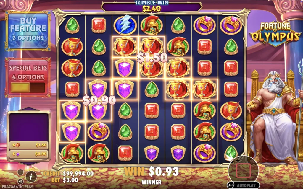 The multiplier symbol is represented by Zeus’ lightning bolt and can appear in both the base game and bonus rounds. When it lands, it takes a random value from x2 to x500. All multipliers that appear during one tumble sequence are added together. Once no more tumbles occur, the total is applied to the full win from that round, potentially creating huge rewards if several big values land at once.