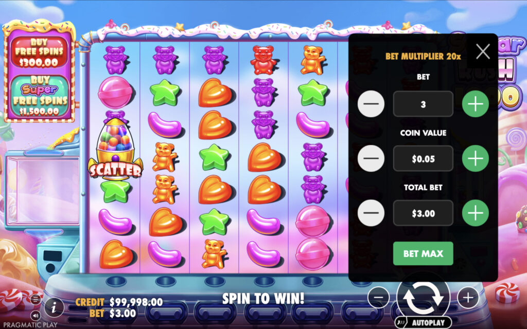 - It has a bet RANGE from $0.20 to $240 per spin. Means it’s making room for both casual and high rollers to achieve the Sugar Rush 1000 max win.