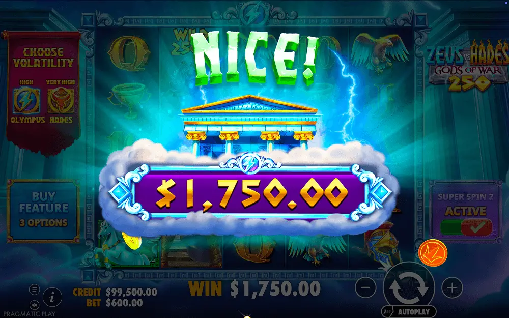 The RTP of Zeus vs Hades 250 is 96.56%. This is up slightly from the original slot, which has a 96.07% RTP. The RTP remains the same regardless of which game mode you select. The RTP is also the same when the feature buy option is utilized. The RTP is higher than the average for online slots and will help to attract many players.