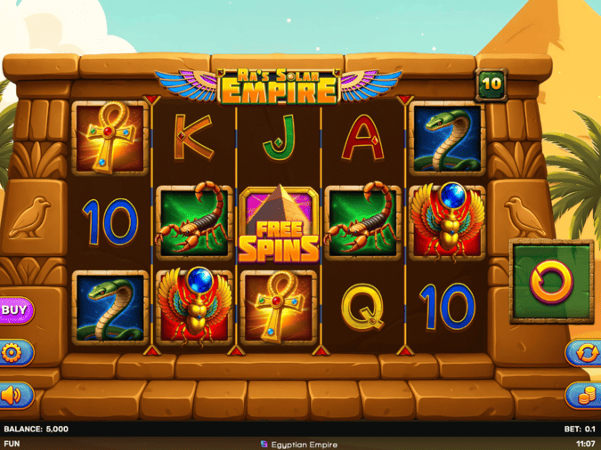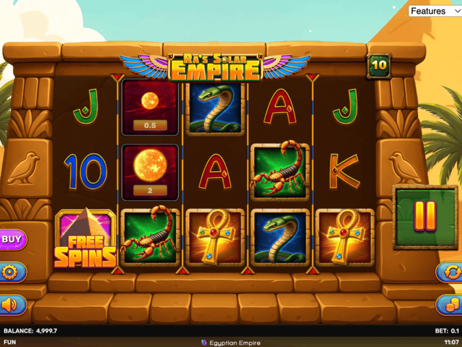 Free Ra’s Solar Empire slot machine operates on a fixed 5×3 grid structure with standard payline configuration. Players initiate spins using manual controls positioned prominently in the interface or activate auto-play functionality for continuous rounds without repeated clicking. The control panel includes betting adjustment options alongside spin activation buttons, though specific stake ranges remain flexible based on player preferences and bankroll management strategies. During base gameplay, medium-paying symbols including golden scarabs, ankhs, scorpions, cobras and solar orbs land across the reels in random configurations determined by the slot’s random number generator. The high volatility 96.2% RTP structure means winning combinations appear less frequently during base spins compared to low volatility alternatives, but successful hits deliver larger payouts relative to bet sizes.