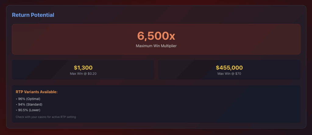 The 6,500x bet maximum win represents the highest possible payout in a single spin or bonus round sequence. At the minimum $0.20 stake, this equals $1,300 in potential winnings. Players wagering the maximum $70 per spin could win up to $455,000 from a single fortunate outcome. This maximum win cap applies across all bet levels, meaning percentage returns remain consistent regardless of stake size.