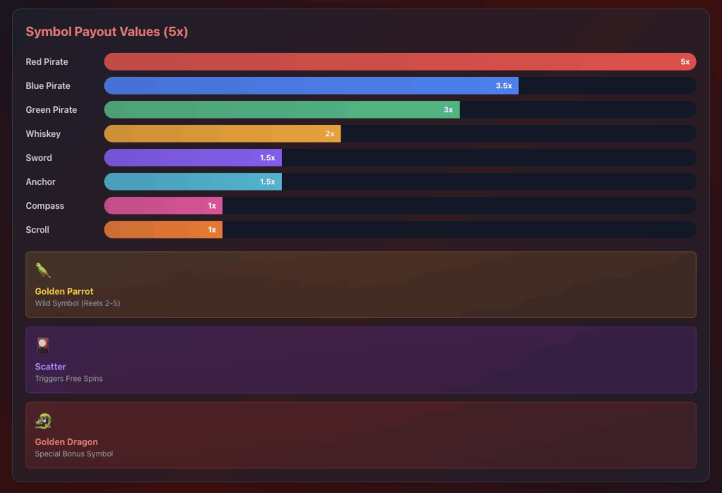 The 5×3 reel structure with 50 fixed paylines creates multiple winning opportunities on each spin. Lower-paying symbols deliver 1x to 2x bet returns when five matching icons land on a payline. Higher-paying pirate character symbols award up to 5x bet for five-of-a-kind combinations. The golden parrot wild appears on reels 2 through 5 only, substituting for all symbols except scatters and Golden Dragons. High volatility means wins arrive less frequently but with larger potential payouts when successful combinations form. The 96% RTP provides theoretical long-term returns aligned with industry standards for premium video slots.