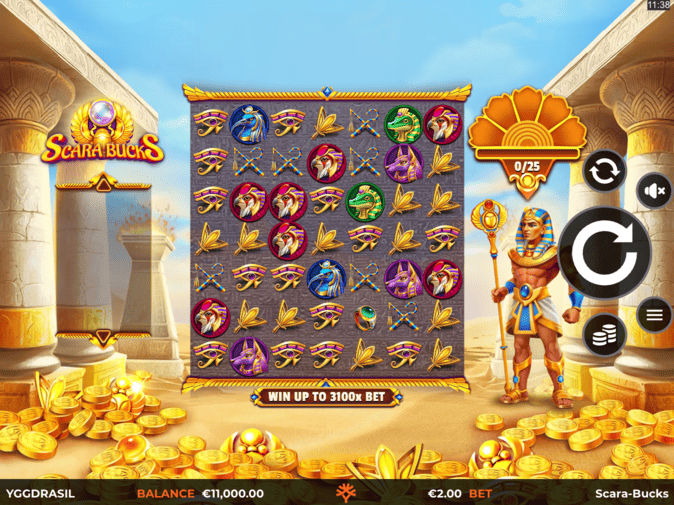 Yggdrasil Gaming presents Scara-Bucks as an Egyptian-themed slot machine launched with a 7×7 grid using cluster pays mechanics instead of standard paylines. The game targets experienced players seeking high-volatility action with wins up to 3,100x the bet amount. Sacred symbols cascade down the grid while a mystical cat guides players through bonus features including the Golden Lotus queue system and Pharaoh Rush splitter.
