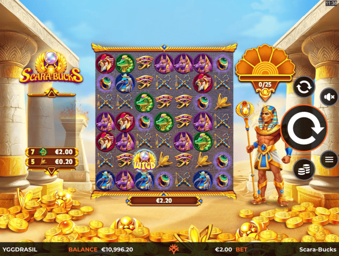 Scara-Bucks does not include traditional free spins rounds that players typically find in standard slot machines. Yggdrasil Gaming designed this title without scatter-triggered bonus games or predetermined free spin quantities. Instead, the Scara-Bucks slot demo and real money versions deliver all winning potential through cascading symbol mechanics and integrated bonus features that activate during regular paid spins.